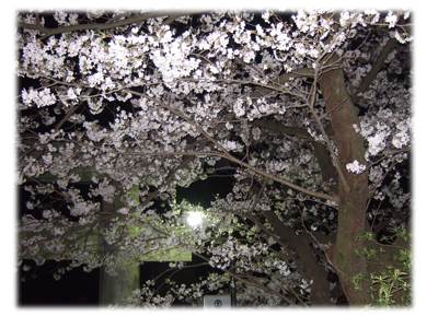 夜桜も幻想的で美しくて。でも、これがなかなか写真に撮りにくいのです。ライトアップの照明が暗い上に、オレンジ色がかっているので、色がかなり変化してしまいます。