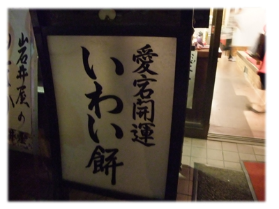夜の9時過ぎだったので、茶店はみんなしまっていました。でも、岩井屋のいわい餅だけ売っていたので、並んで買いました。