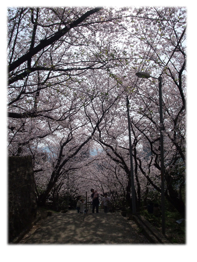 かなり高く登った場所から下を振り向くと、桜で彩られた花階段は、なかなか見事です。