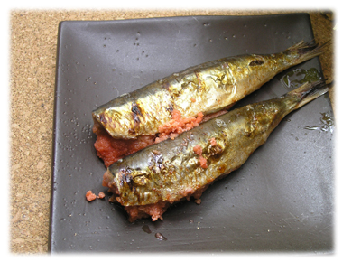 脂の乗った小ぶりの鰯に、明太がしっかり詰まっています。じゅうじゅういっている焼きたてをご飯にのせてたべると、うまー!