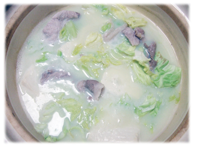 ところが土鍋に温泉調理水と温泉豆腐を加えて中火にかけるとあったまるにつれて白濁していきます。