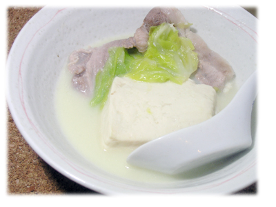おかずだったのでバランスを考えて、小量の豚肉とキャベツを加えちゃったのですが、これは失敗でした。キャベツも溶けて緑色がでちゃった。
