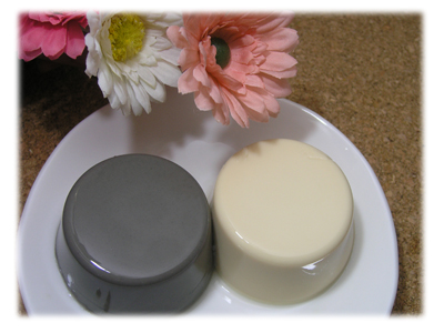 さて、開けてみましょう。とうふプリンと黒ゴマプリンの二種類が入っています。
