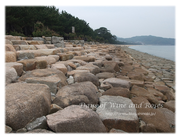 ここの海岸縁を行くと、防塁跡にでます。砂浜に石が積み上げて護岸工事してあるなあぁ。