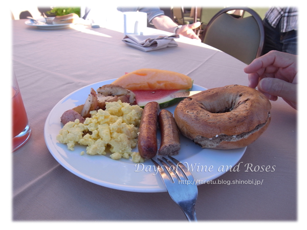 例によって、朝からてんこもりの配偶者の皿です。ベーグルが美味しそう。