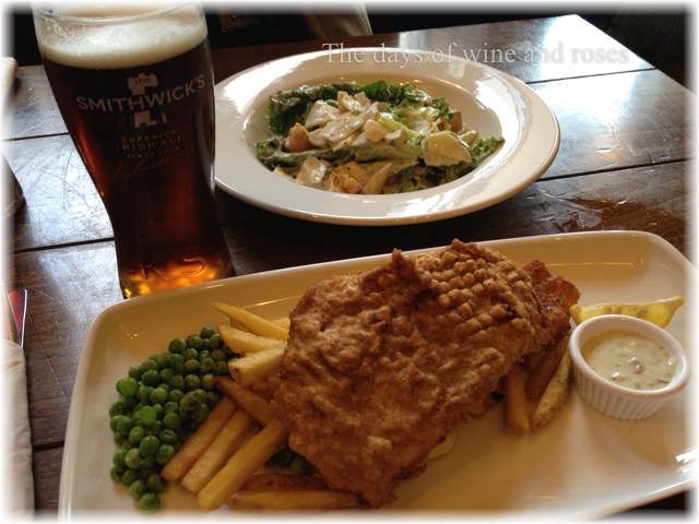 食事はもちろんフィッシュ&チップスとサラダです。ボリュームがすごいので、二人でとって半分こします。パブはサーブされず自分で飲み物食べ物を取りに行くので、こういうことが簡単にできます。
