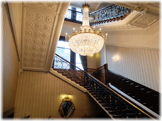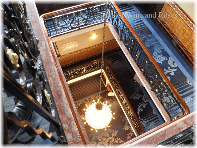 階段上から下のシャンデリアまでを見た別角度。フロックコートの紳士やロングドレスの淑女が相応しい趣かと。
