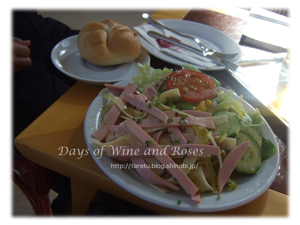 で、食べ物は、チーズとハムのサラダを二人ではんぶんこ。パンまでついていて、軽い昼ご飯にはぴったりです。
