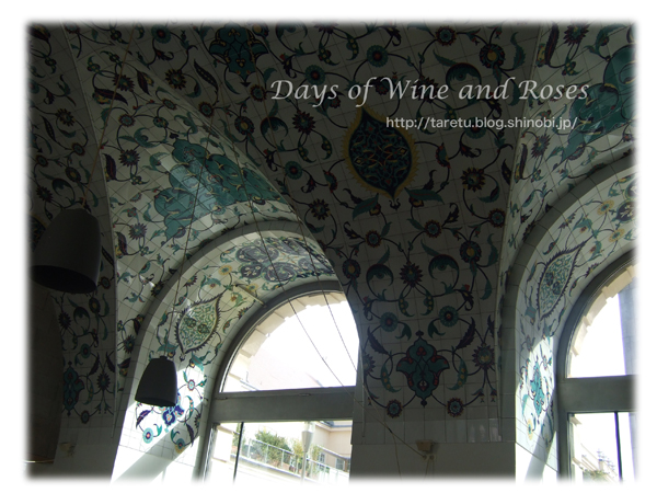 トルコのモスクのようなアラビア模様のタイルで天井が飾られていて、モダンスタイルのバーとのヘンな対比をしています。