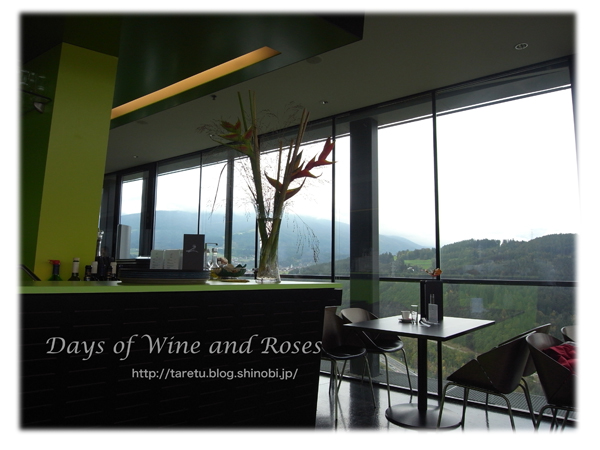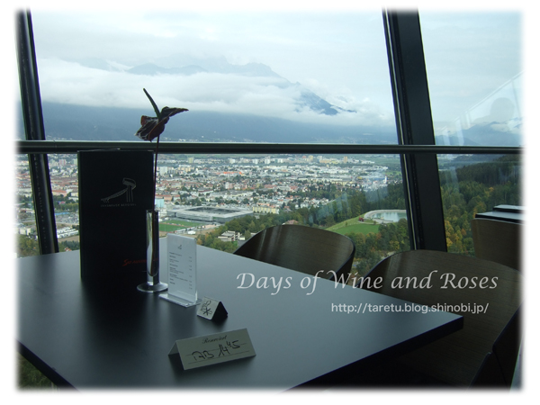 窓の外には緑の山々と赤い屋根が多いインスブルックの街並みが一望できます。