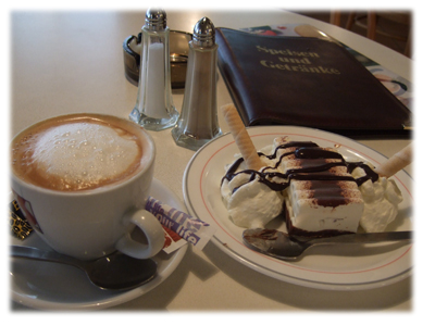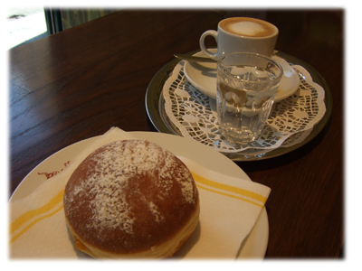 アンズジャムを入れた揚げドーナツのようなファッシングスクラプフェンです。勿論発音できないので、店頭でコレ!っていって指さす。んで、「だす、びって」(コレ、おくれ)