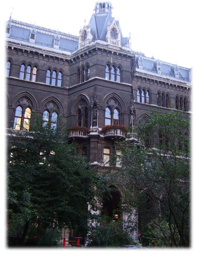 歓迎会はRathausと呼ばれている市庁舎の中庭で開催。会議の人数がかなり多いので、結構な混雑でした。市庁舎といってもネオゴシック様式の美しい建物。