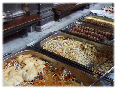 夕方ですが、まだまだ日が沈まず暑いので、メイン料理はいささか暑苦しい。でも、魚のフライみたいなのは美味しかったです。結構早めになくなってますね。