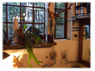 内庭に向かった窓辺に飾られたジャム瓶。古いタイプの蛇口が、なんとなくレトロチックでかっこよく感じるのが不思議…。