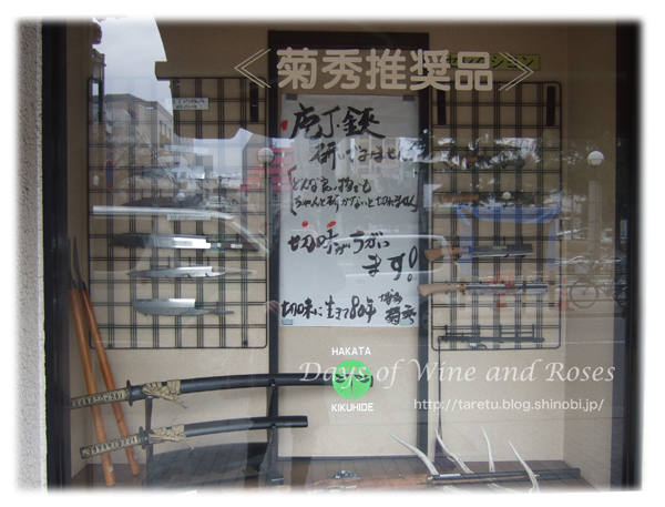 ウィンドウには、鍛えられた日本刀や、板前さんやコックさんが使う料理人向け包丁が並んでいます。
