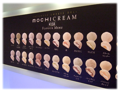 で、こちらがそのモチクリームの見本。1個158円です。とにかく種類が多い。配偶者が一個だけを選ぶのにえらい苦労をしていました。