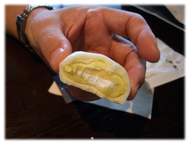 さてさて肝腎のモチクリーム。冷凍で売っているので、食べるには15分ほど置いてください、と言われました。そこで最初にシュークリームのほうを食べたんだけど、まだまだ中身カチカチっぽいです。