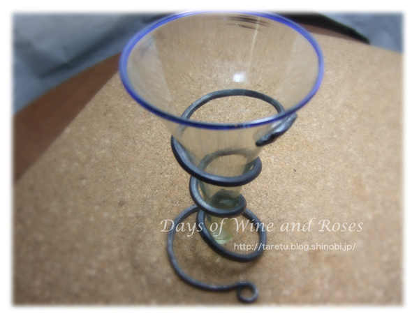 グラスの足をつくる技術がなかったので、金属でガラスを支えてあります。ヘビのような感じの金属部分がなかなか面白い。