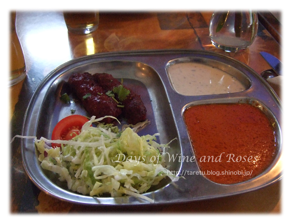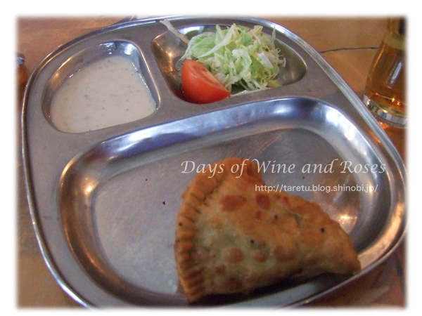 そこで前菜の中でヴェジタリアンフードはこれです、と言われたサモサにしてみました。結果からしてこれは大失敗。忘れてましたサモサってポテト入りの揚げギョーザだもの。