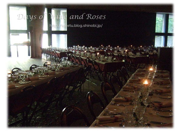 もちろん、本格的なディナーでワイングラスも赤白並んでます。椅子こそ、折り畳み式ですが、きちっと布のテーブルクロスで本格的。