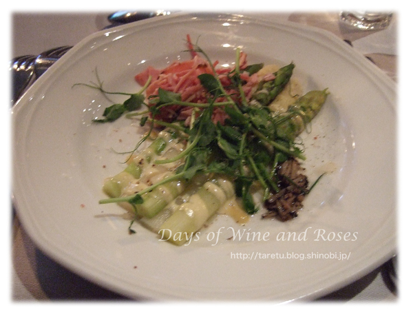 まずは前菜として出てきたのが、アスパラガス。グリーンとホワイトの中間くらいでしょうか、味付けはあっさりとオリーブオイルとマヨネーズソース。