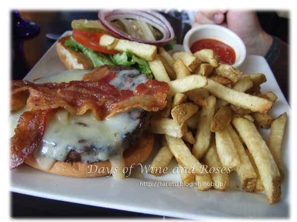 北米で地ビールとくれば、食べ物はハンバーガーの一択。正統派ともいうべき、炭火で焼いたバーガーパテ、新鮮な野菜のアメリカン・ハンバーガーです。