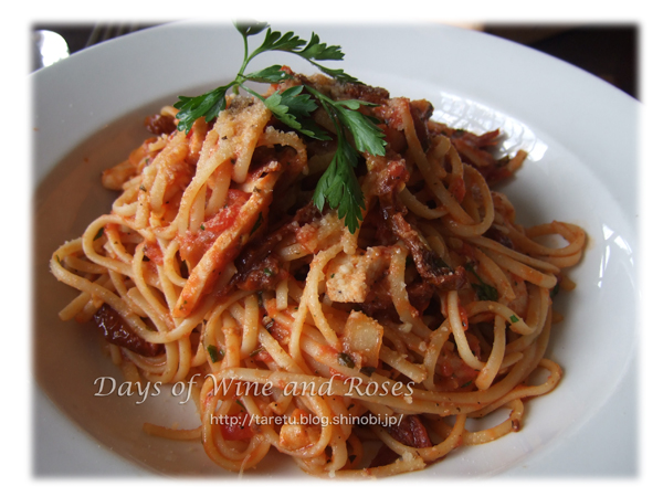 で、私は仕方がないから、パスタ。リングイネのトマトソースです。いや、北米で食べるにしては、ちゃんとしたスパゲティでしたよ。うん。美味しかった。負け惜しみじゃないやい。