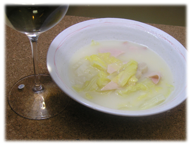 白ワインのおつまみは、ハムと白菜のクリーム煮を。