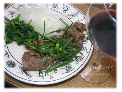 付け合わせに、タマネギのスライスと花ニラを炒めたものを取り合わせました。