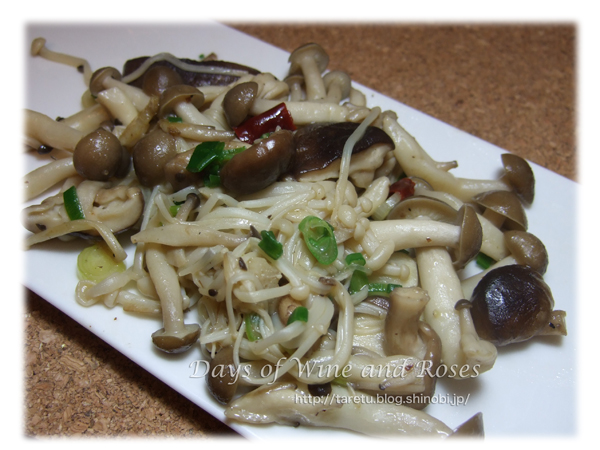 さて、こういったスパークリングワインに相性ぴったりのおつまみは、茸の炒め物です。数種類の茸を、ニンニクや鷹の爪といっしょに炒めただけの簡単な料理ですが、これがもう白ワインのために生まれたような料理なのですよ。