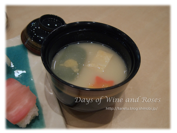 お茶漬けにもついていた京都風の白味噌の味噌汁。葛でとろみがついていて、甘くて、こちらもうんまいです。