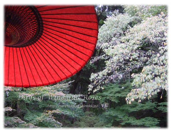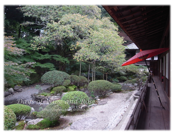 緋色の傘ごしの庭の風景もなかなか風情のあるものです。