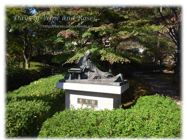 庭の一角には紫式部の銅像がありました。平安の世の同人作家。石山の月を見ながら思いにふける様の絵は、有名な画題となってきたようです。