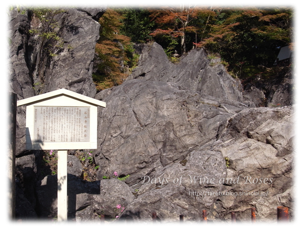 本堂は国の天然記念物の珪灰石(「石山寺硅灰石」)という巨大な岩盤の上にたっています。寺の名前の由来でもあります。ごつごつとした岩肌が面白い。珪灰石だから、マグマが陥入したときに石灰岩と珪素が化合してできた岩です。