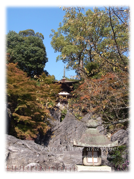 ごつごつした岩山の向こうに、美しい宝塔が見えます。