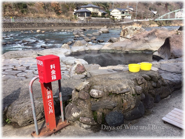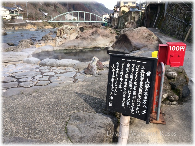 川の側には天然の石を使った公衆の露天風呂。入力料100円でおっけー。水着の着用もおっけー。ちゃんと着替える場所もあります。