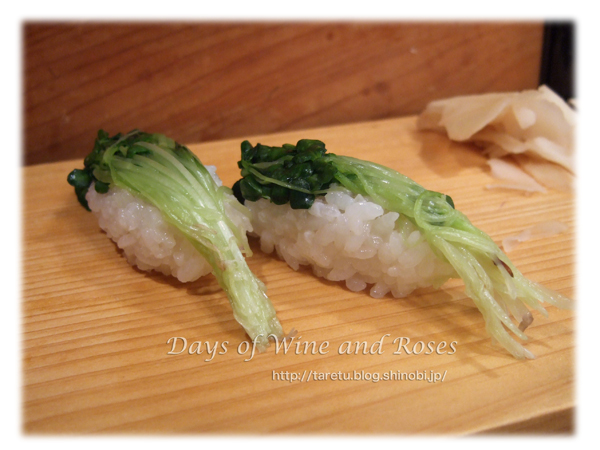 旨味たっぷりのお魚を頂いたので、次は少しあっさりと。かいわれのにぎりをお願いしました。かいわれは昆布〆にしてあります。