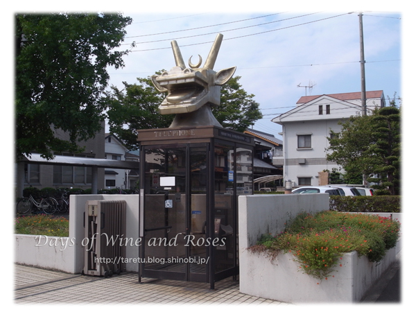 極めつけが、市役所の横にあった、金色の牛鬼ヘッドのついた公衆電話ボックス。