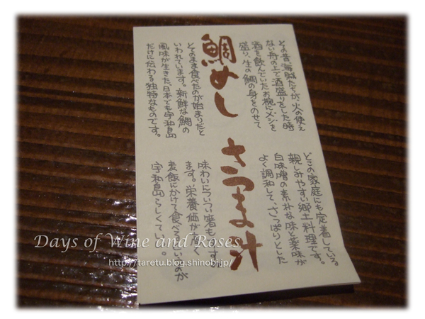 これに鯛をつけて、ご飯といっしょにいただくのです。鯛茶漬けともちょっと似ているかなぁ。
