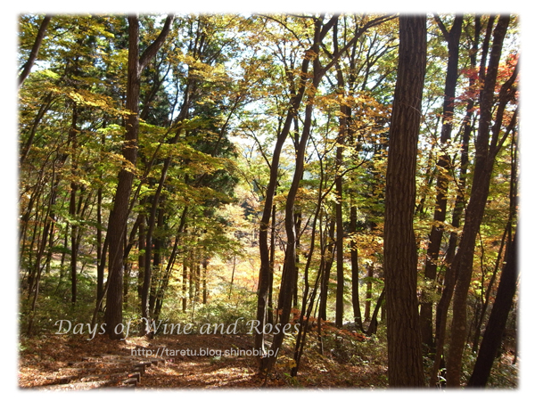 色づく木の葉が舞い、地面をカーペットのように埋め尽くしています。よく手入れがされた、素晴らしい森です。