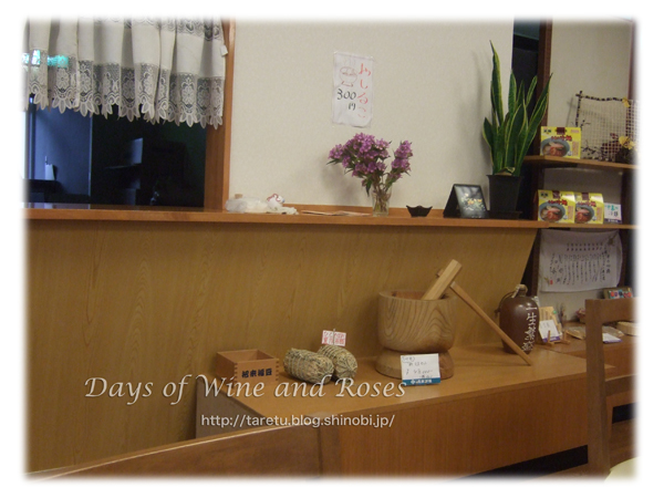 お正月だけじゃなくて、普通の日にも。カウンターの台には、餅つきの臼ときねのミニチュアが置いてありました。