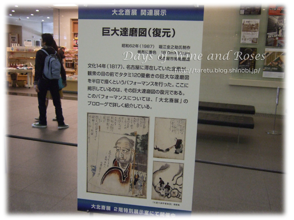 パネルでの説明によれば、北斎は文化14年(1817)年に名古屋で、タタミ120畳敷きの巨大な達磨図を半日で描くというパフォーマンスを行ったそうで。この大達磨は、その復元だそうです。やることデカイね。「けれん」の画家北斎です。