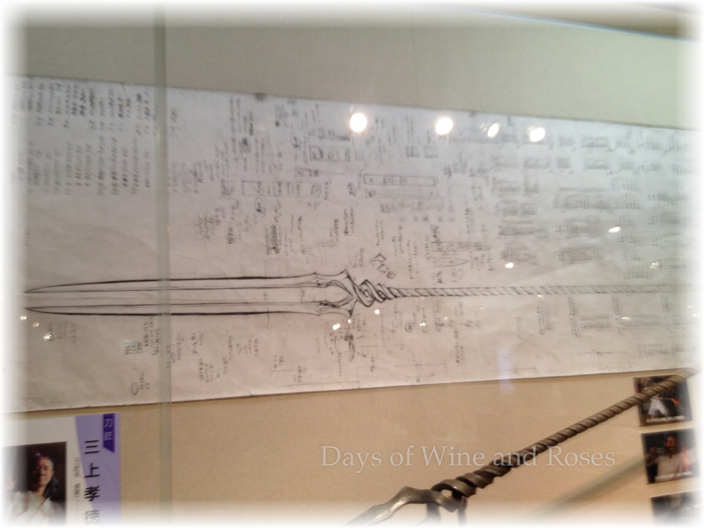 バックには制作過程で用いた設計図が飾ってありました。細かい指示がたくさん書き込んであって、この怪物のような槍の制作のご苦労が偲ばれます。