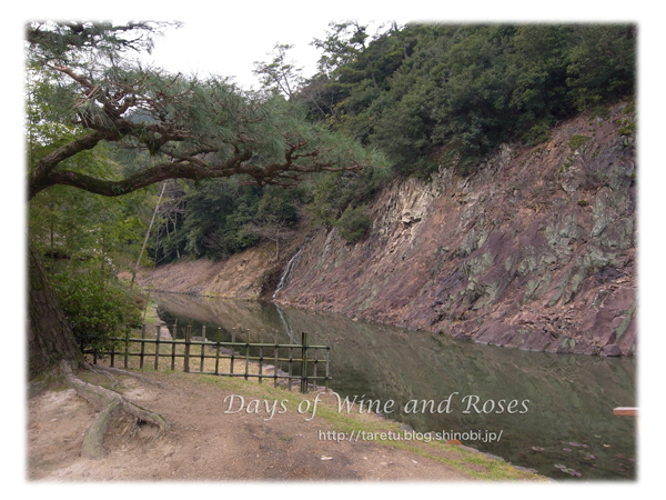 石壁(赤壁)と名付けられた岩が剥きだしになった崖。当然、三国志の赤壁からでしょう。自然の造形をまんま活かした庭のつくり。日本庭園ならでは、というか。