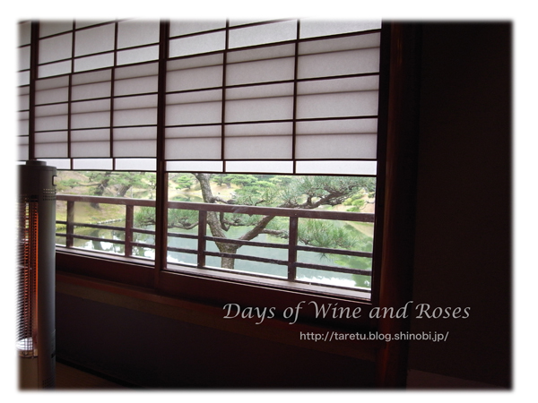 3組もお客さんがいるので、ちょっとだけ狭いかな。雪見障子から、栗林公園が見えます。この雰囲気はよいです。