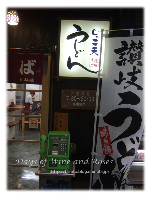 配偶者は名物のじゃこ天うどんを。これに棚から海老天をとって、海老天じゃこ天うどんという贅沢なシロモノにしてました。