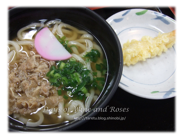 配偶者の真似をしてえび天をいっしょにしましたが、店の内部にあったポスターのように、この肉うどんに関しては温泉タマゴのほうが向いているようです。次に行った時はかならず温泉タマゴのせ肉うどんにしよーっと。