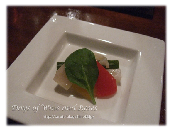 お通しはピクルスですね。彩りも楽しく。白ワインにたいへんよくあうお味。