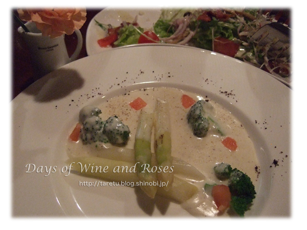 白アスパラのホワイトソース。これまたワインにあう料理ですね。あっさりめのホワイトソースで、さっぱり風味。