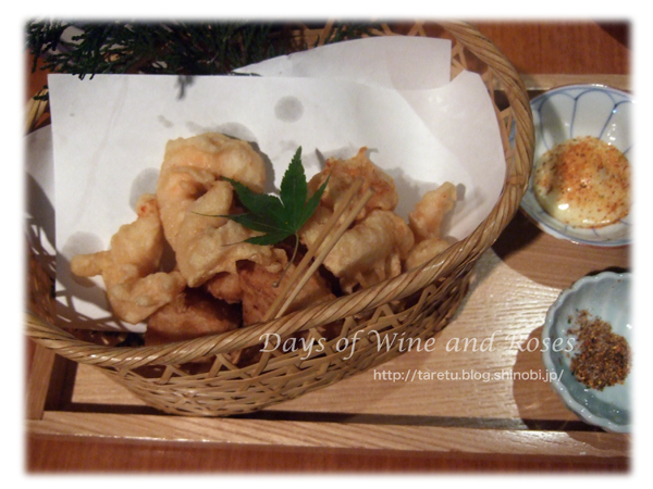 海老と京芋の天ぷらです。京芋は里芋の一種。さっくりした外側と、ほっくりした内側の食感がいいですね。海老の天ぷらとよく合います。